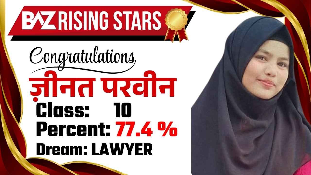 рд╕рд╛рджрдЧреА рднрд░реЗ рдорд╛рд╣реМрд▓ рд╕реЗ рдирд┐рдХрд▓рдХрд░ рдЕрдкрдиреЗ рд╕рдкрдиреЛрдВ рдХреЛ рд╣рдХреАрдХрдд рдореЗрдВ рдмрджрд▓рдиреЗ рдХреА рд░рд╛рд╣ рдкрд░ рдмрдврд╝рддреА рд╣реБрдИ рдЬрд╝реАрдирдд рдкрд░рд╡реАрди рдиреЗ 10рд╡реАрдВ рдмреЛрд░реНрдб рдкрд░реАрдХреНрд╖рд╛ рдореЗрдВ 77.4% (386/500) рдЕрдВрдХ рд╣рд╛рд╕рд┐рд▓ рдХрд░ рдЕрдкрдиреЗ рд╡рд╛рд▓рд┐рджреИрди рдФрд░ рдЗрд▓рд╛рдХреЗ рдХрд╛ рдирд╛рдо рд░реЛрд╢рди рдХрд┐рдпрд╛ рд╣реИред рдпрд╣ рдХрд╛рдордпрд╛рдмреА рд╕рд┐рд░реНрдл рдирдВрдмрд░ рдирд╣реАрдВ, рдмрд▓реНрдХрд┐ рдЙрдирдХреА рдореЗрд╣рдирдд, рд╕рдмреНрд░ рдФрд░ рдордЬрдмреВрдд рдЗрд░рд╛рджреЗ рдХреА рдХрд╣рд╛рдиреА рд╣реИред