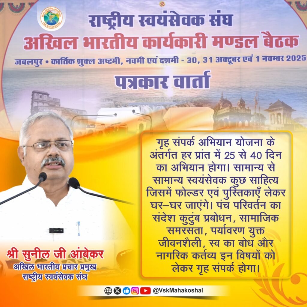आंबेकर ने बताया कि संघ द्वारा गृह संपर्क अभियान के तहत प्रत्येक प्रांत में 25 से 40 दिन तक अभियान चलाया जाएगा। स्वयंसेवक घर-घर पहुंचकर साहित्य वितरित करेंगे।