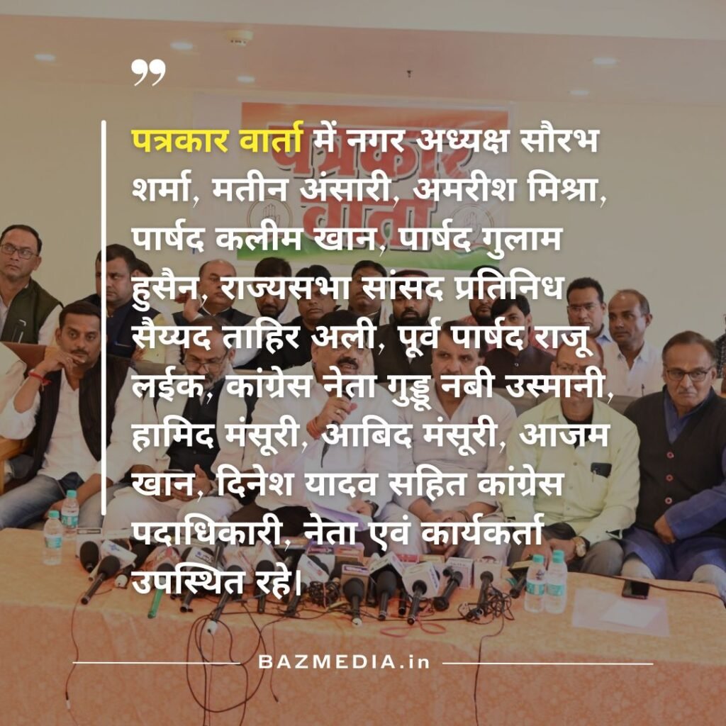 पत्रकार वार्ता में नगर अध्यक्ष सौरभ शर्मा, मतीन अंसारी, अमरीश मिश्रा, पार्षद कलीम खान, पार्षद गुलाम हुसैन, राज्यसभा सांसद प्रतिनिध सैय्यद ताहिर अली, पूर्व पार्षद राजू लईक, कांग्रेस नेता गुड्डू नबी उस्मानी, इश्तियाक अंसारी, हामिद मंसूरी, आबिद मंसूरी, आजम खान, दिनेश यादव, रमाकांत रावत, सतीश तिवारी, सहित कांग्रेस पदाधिकारी, नेता एवं कार्यकर्ता उपस्थित रहे।