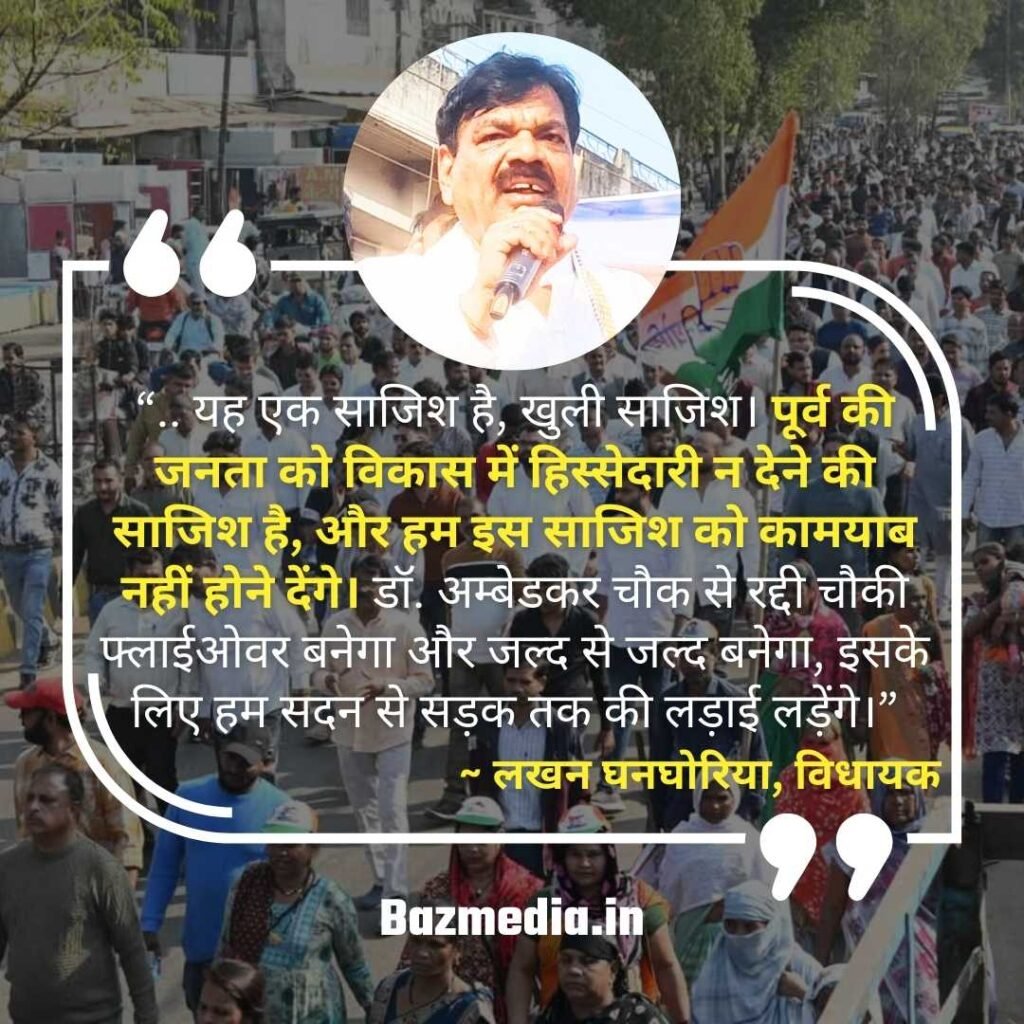 पूर्व विधानसभा क्षेत्र के विधायक लखन घनघोरिया ने कहा, “यह एक साजिश है, खुली साजिश। पूर्व की जनता को विकास में हिस्सेदारी न देने की साजिश है, और हम इस साजिश को कामयाब नहीं होने देंगे। पूर्व में फ्लाईओवर बनेगा और जल्द से जल्द बनेगा, इसके लिए हम सदन से सड़क तक की लड़ाई लड़ेंगे। न्याय, सम्मान और समानता का अधिकार बाबा साहब के बनाए संविधान ने हर देशवासी को दिया है। आज हमने बाबा साहब की प्रतिमा पर संकल्प लिया है कि हम पूर्व विधानसभा को न्याय दिलाने, सम्मान दिलाने और विकास में समान भागीदारी दिलाने के लिए संघर्ष करेंगे।”