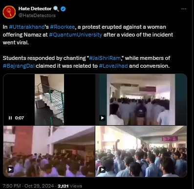 हाल ही में उत्तराखंड की क्वांटम यूनिवर्सिटी में एक मुस्लिम छात्रा द्वारा परिसर में नमाज़ अदायगी को लेकर विवाद हो गया। जब छात्रा ने शांतिपूर्ण तरीके से सीढ़ियों के पास कोने में नमाज़ पढ़ी, तो कुछ छात्रों ने इसे मुद्दा बनाकर विरोध करना शुरू कर दिया।