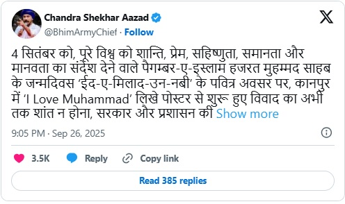 рдЪрдВрджреНрд░рд╢реЗрдЦрд░ рдЖрдЬрд╝рд╛рдж рдХрд╛ рдпрд╣ рдЖрдХреНрд░рд╛рдордХ рд░реБрдЦ рд╕рд╛рдл рджрд┐рдЦрд╛рддрд╛ рд╣реИ рдХрд┐ тАЬрдЖрдИ рд▓рд╡ рдореБрд╣рдореНрдорджтАЭ рд╡рд┐рд╡рд╛рдж рд╕рд┐рд░реНрдл рдзрд╛рд░реНрдорд┐рдХ рдирд╣реАрдВ, рдмрд▓реНрдХрд┐ рд░рд╛рдЬрдиреАрддрд┐рдХ рдореЛрд░реНрдЪрд╛ рдмрди рдЪреБрдХрд╛ рд╣реИред
