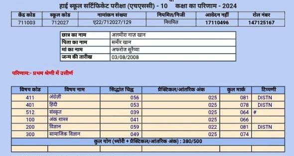 समीरा ने 10 क्लास की परीक्षा में 500 में से 380 अंक हासिल किये हैं। उन्होंने मैथ्स में 66, विज्ञान में 81, सामाजिक विज्ञान में 74, अंग्रेजी में 81 और हिन्दी में 78 मार्क्स हासिल किय हैं।