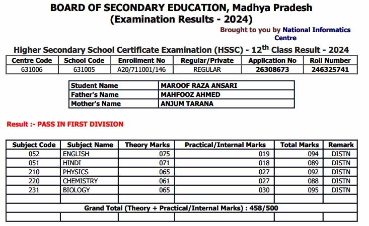 मारूफ ने 12 वीं क्लास में 500 में 458 अंक हासिल किये हैं। मारूफ का बायोलाजी में 95 , फिजिक्स में 92, कैमिस्ट्रि में 88, अंग्रेजी में 94 और हिन्दी 89 नम्बर मिले हैं।