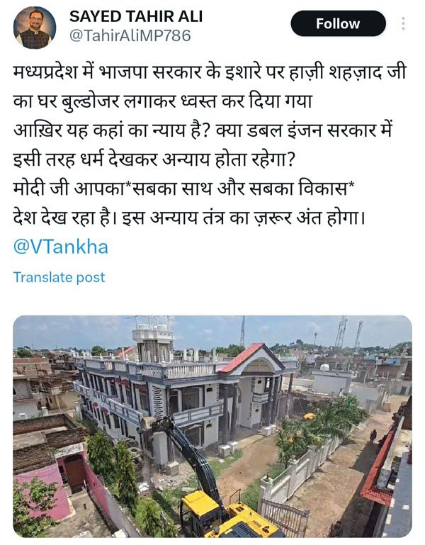 शुक्रवार को राज्यसभा सांसद विवेक कृष्ण तन्खा के प्रतिनिधि सैय्यद ताहिर अली ने अपने सोशल मीडिया अकाउंट पर लिखा है कि, मध्य प्रदेश में भाजपा सरकार के इशारे पर हाजी शहजाद का घर बुल्डोजर लगाकर ध्वस्त कर दिया गया। आखिर यह कहा का न्याय है। क्या डबल इंजन सरकार में इसी तरह धर्म देखकर अन्याय होता रहेगा। मोदी जी आपका सबका साथ और सबका विकास देश देख रहा है। इस अन्याय तंत्र का अंत होगा।